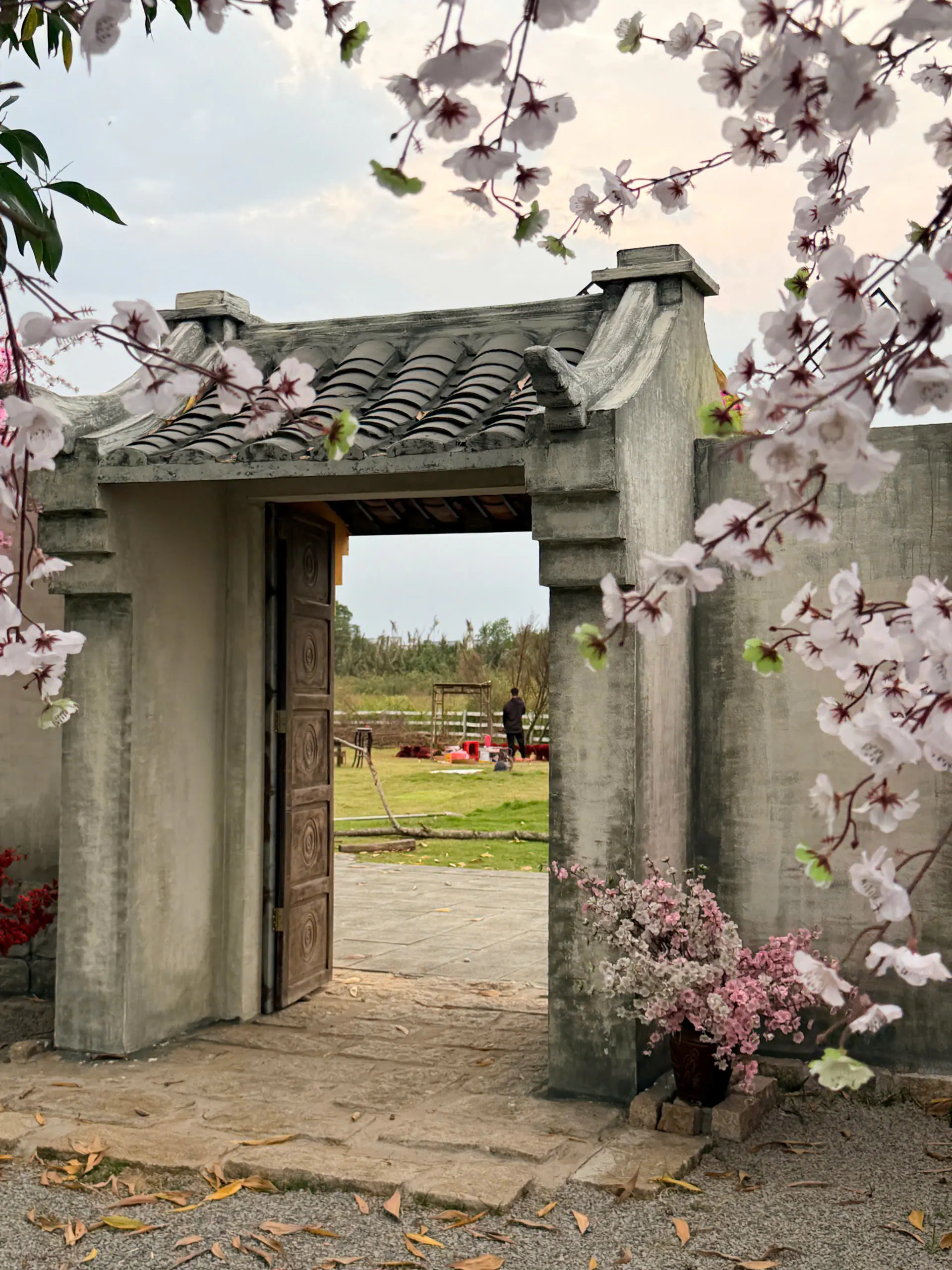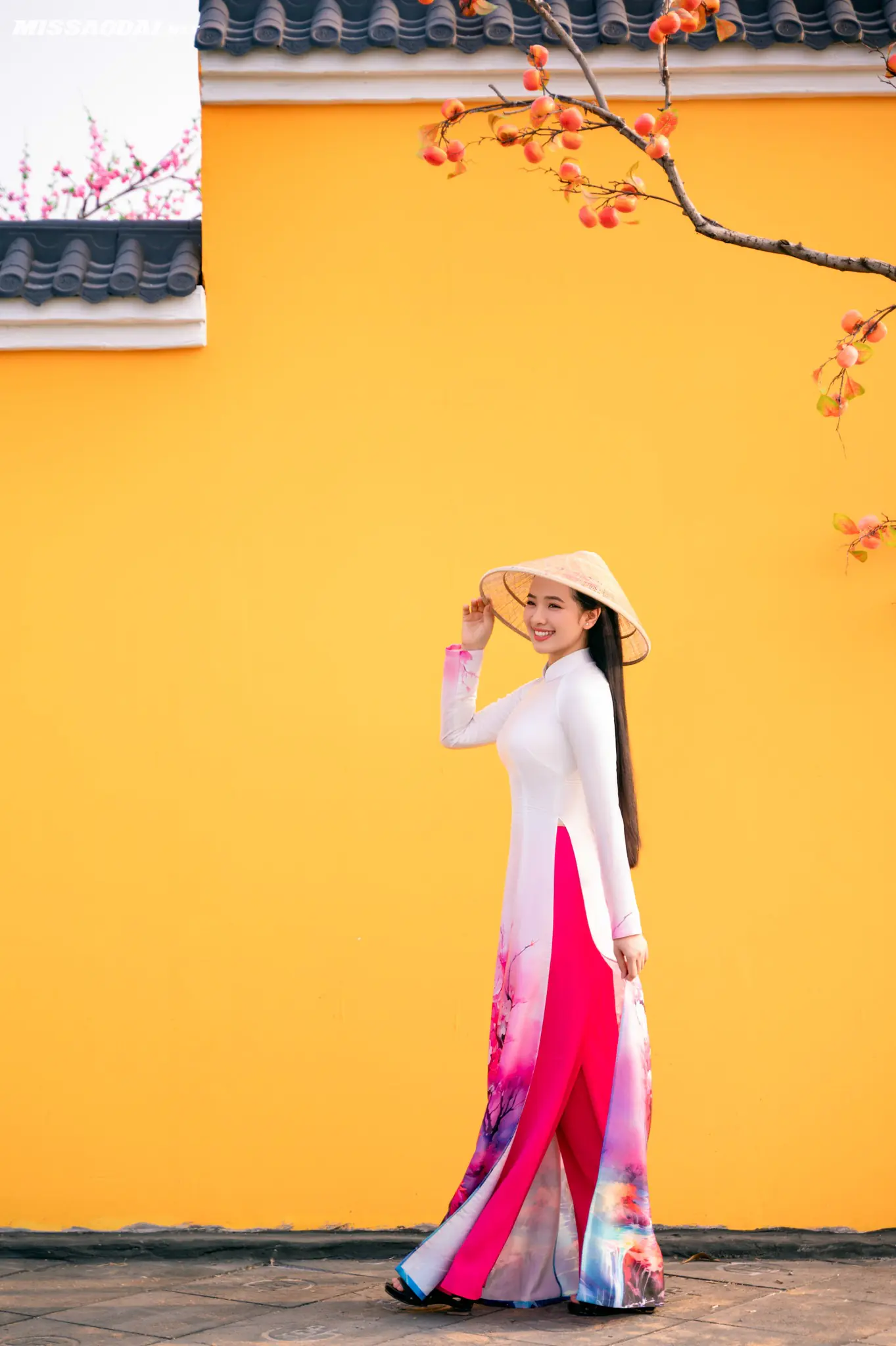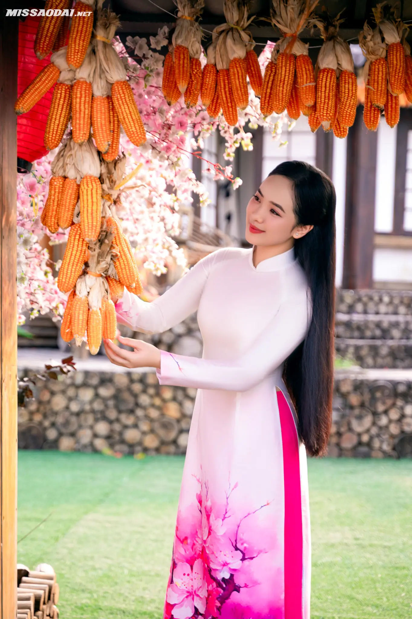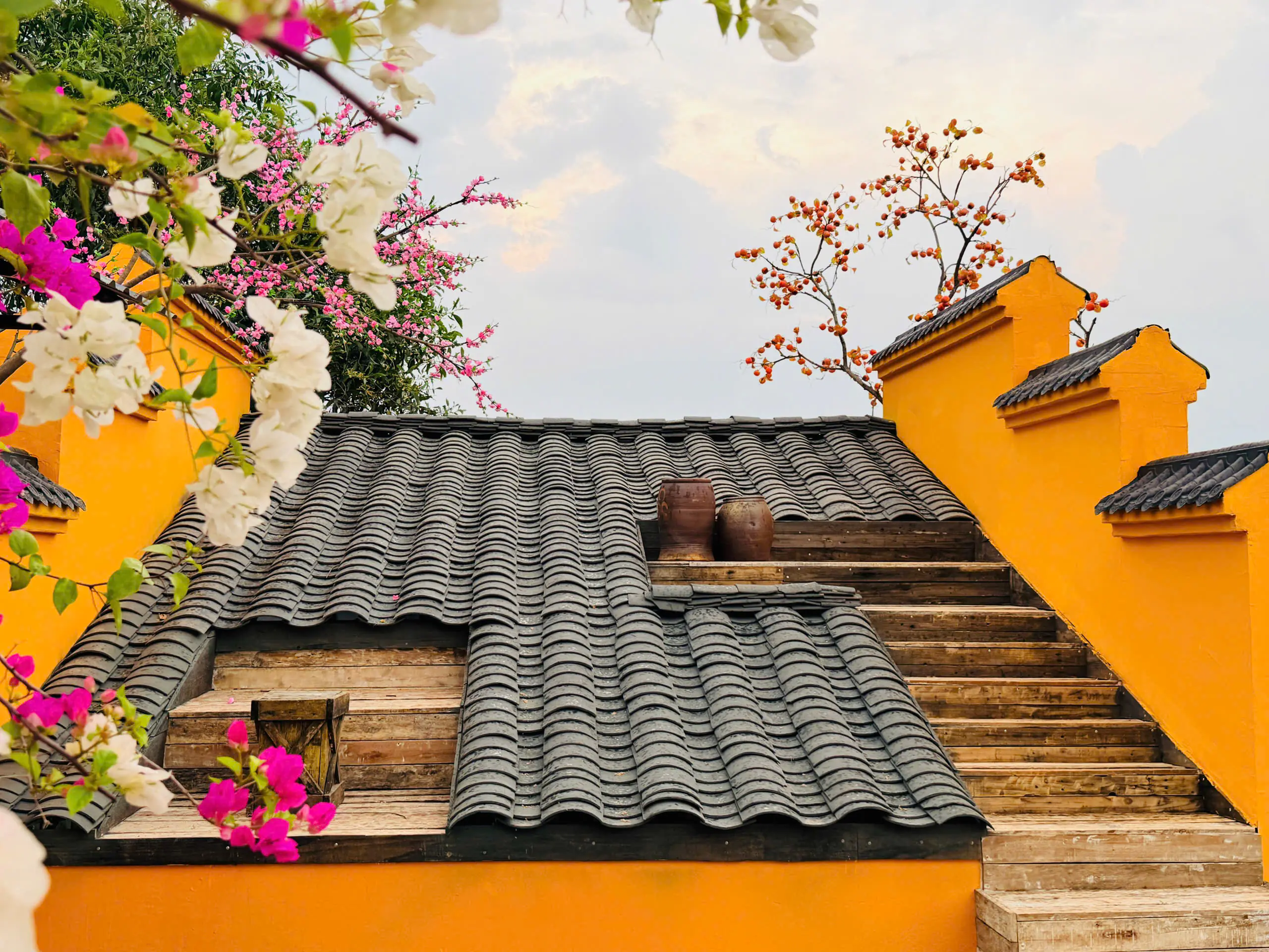 Dạo một vòng Sunny Garden, bạn sẽ bắt gặp đủ kiểu background như cổng vòm phủ hoa hồng phấn, lối đi nhỏ với ánh nắng chiếu nghiêng, bậc thềm gỗ dẫn lên mái ngói, hay những mảng tường vàng nổi bật dưới trời xanh. Hoa đào, hoa giấy, những chùm quả đỏ được điểm xuyết vừa đủ, không quá “làm màu” nhưng đủ để tạo cảm giác xuân đang đến rất gần.