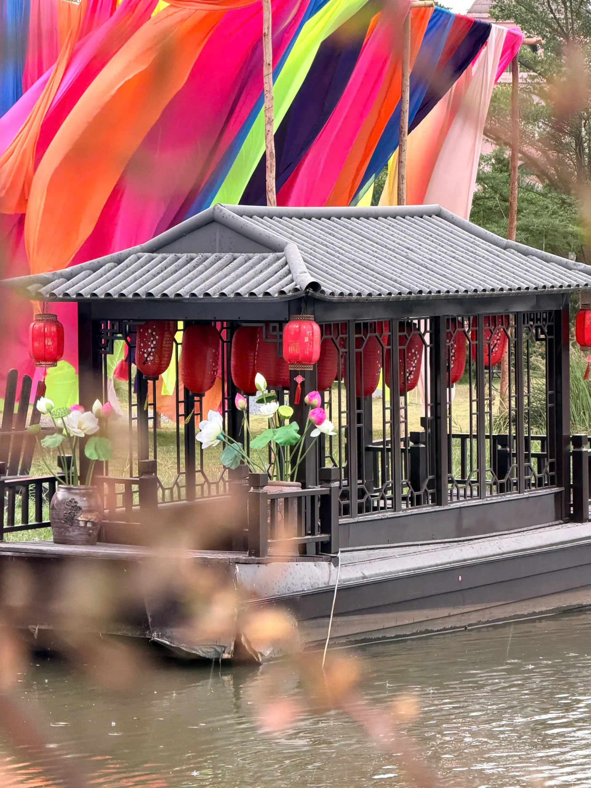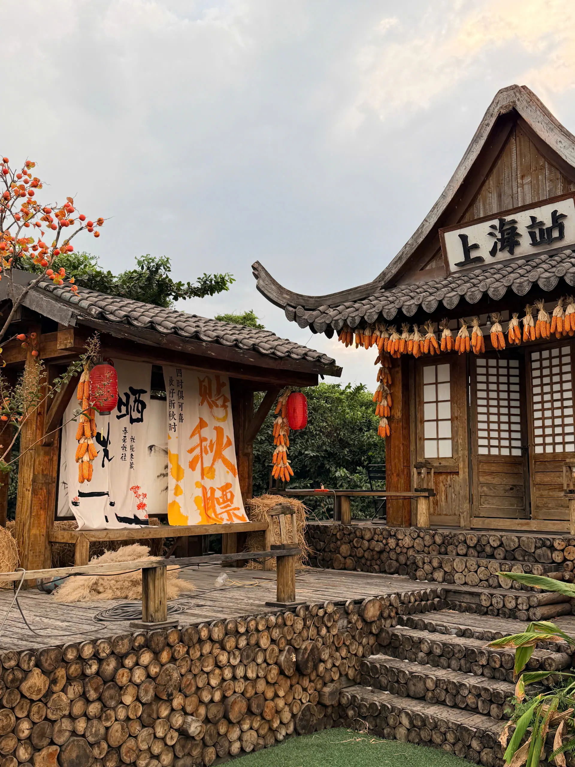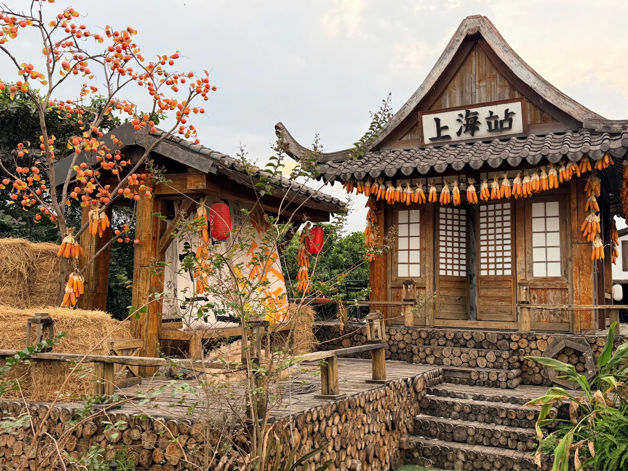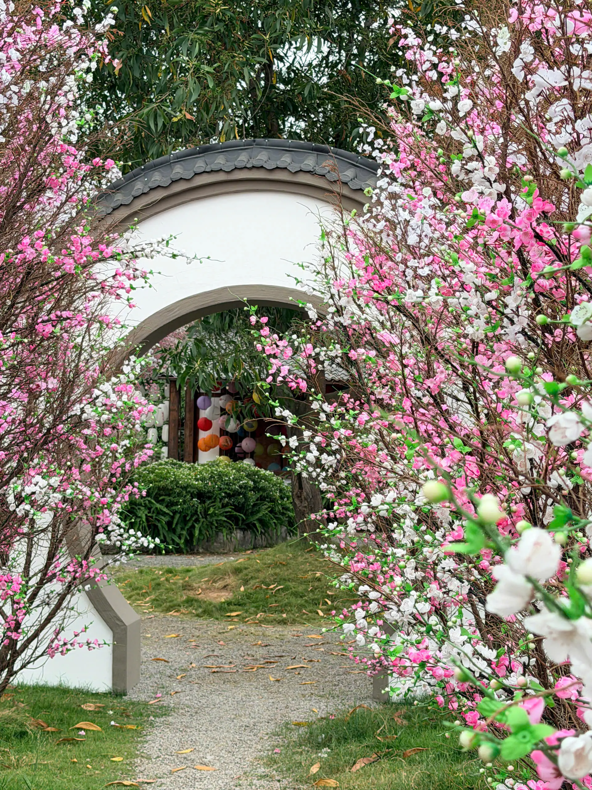 Dạo một vòng Sunny Garden, bạn sẽ bắt gặp đủ kiểu background như cổng vòm phủ hoa hồng phấn, lối đi nhỏ với ánh nắng chiếu nghiêng, bậc thềm gỗ dẫn lên mái ngói, hay những mảng tường vàng nổi bật dưới trời xanh. Hoa đào, hoa giấy, những chùm quả đỏ được điểm xuyết vừa đủ, không quá “làm màu” nhưng đủ để tạo cảm giác xuân đang đến rất gần.
