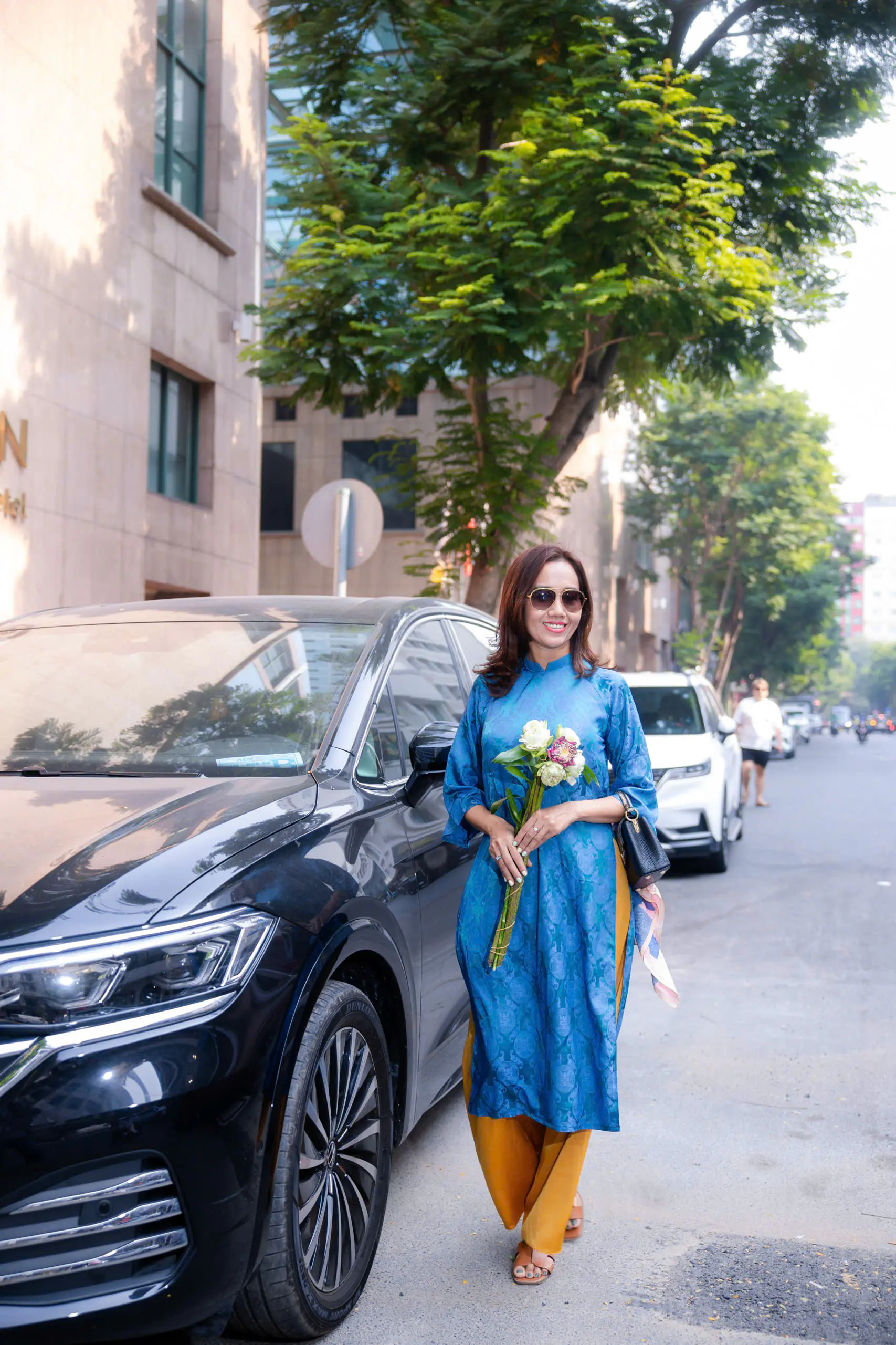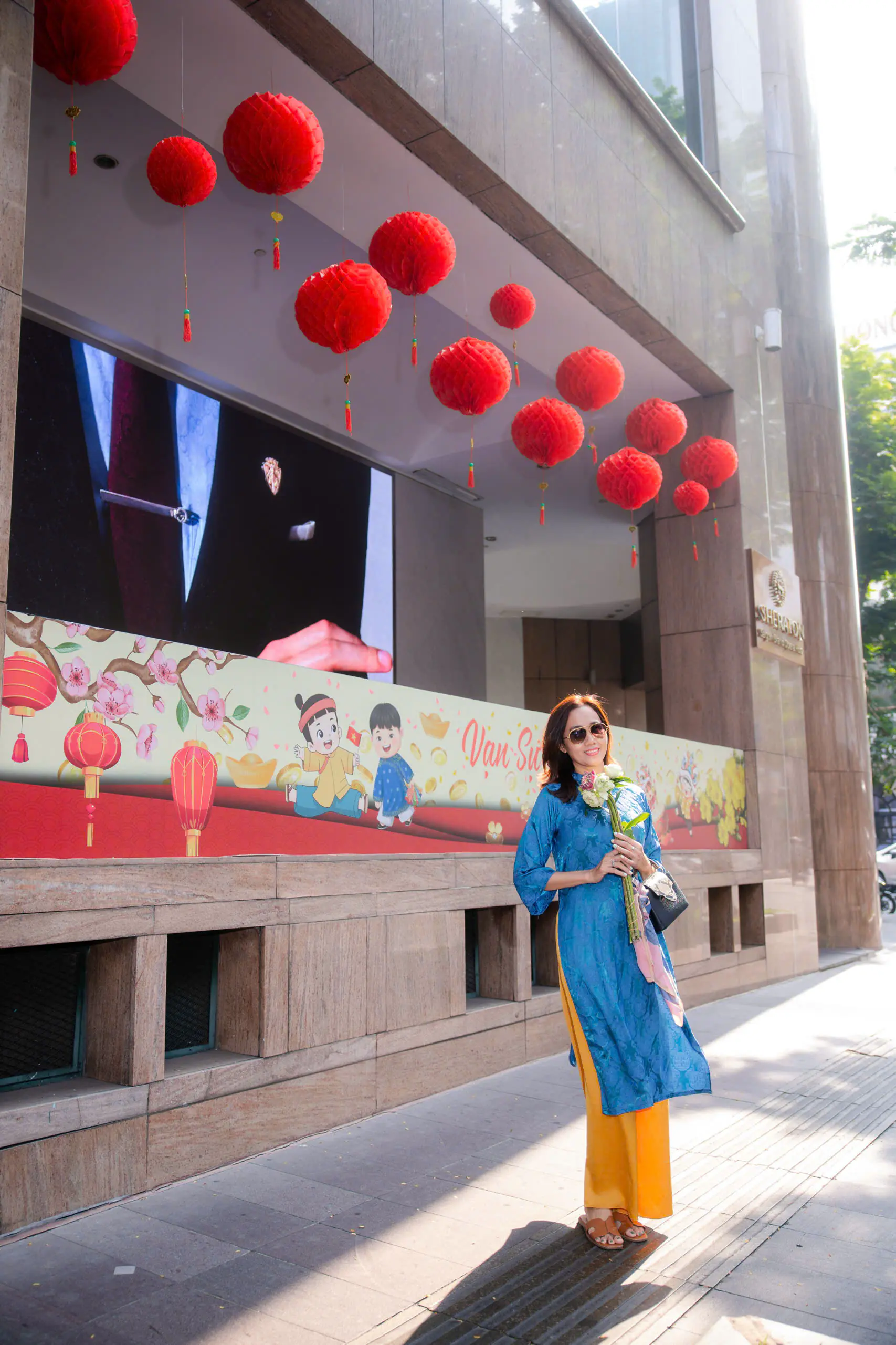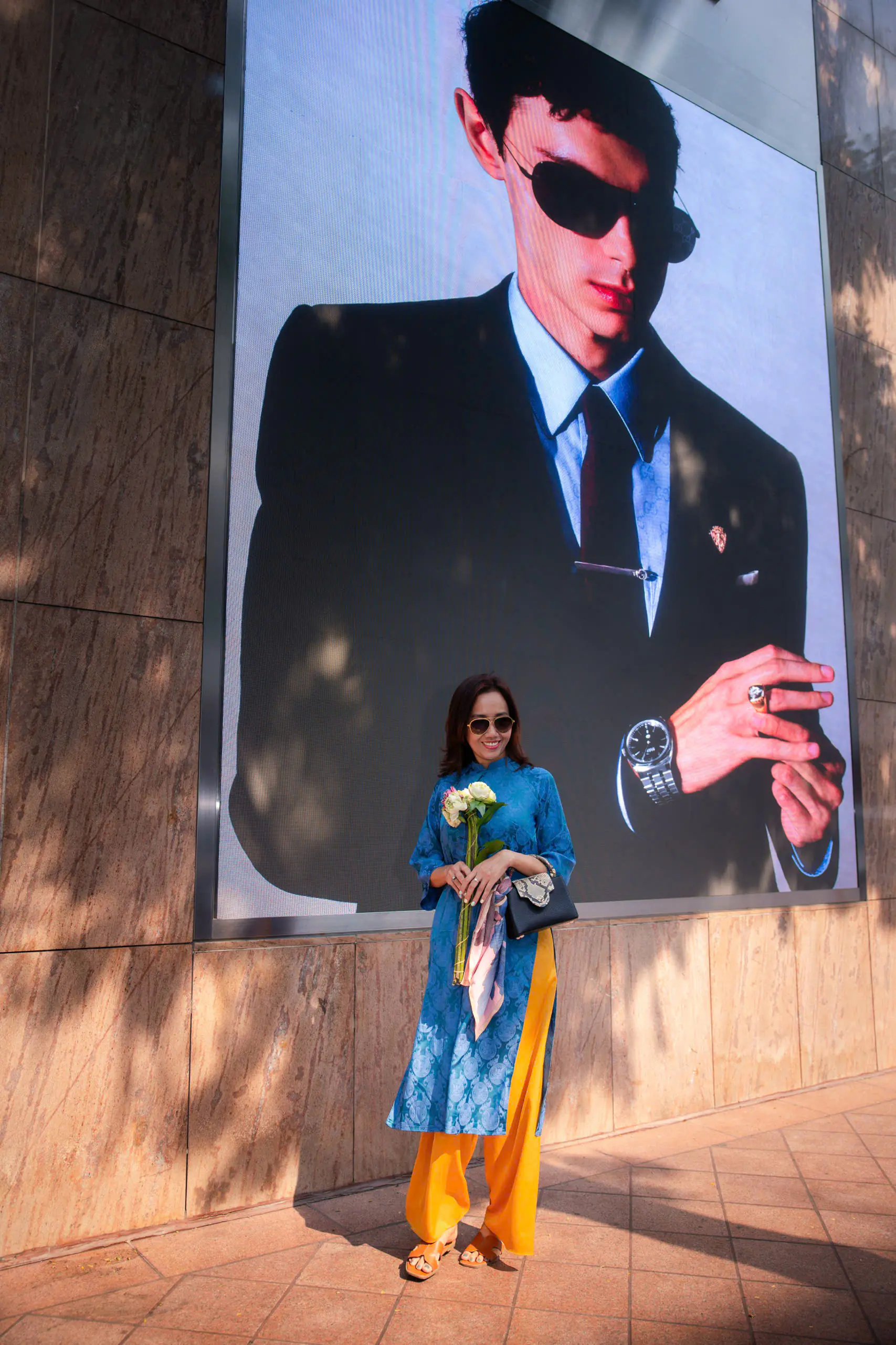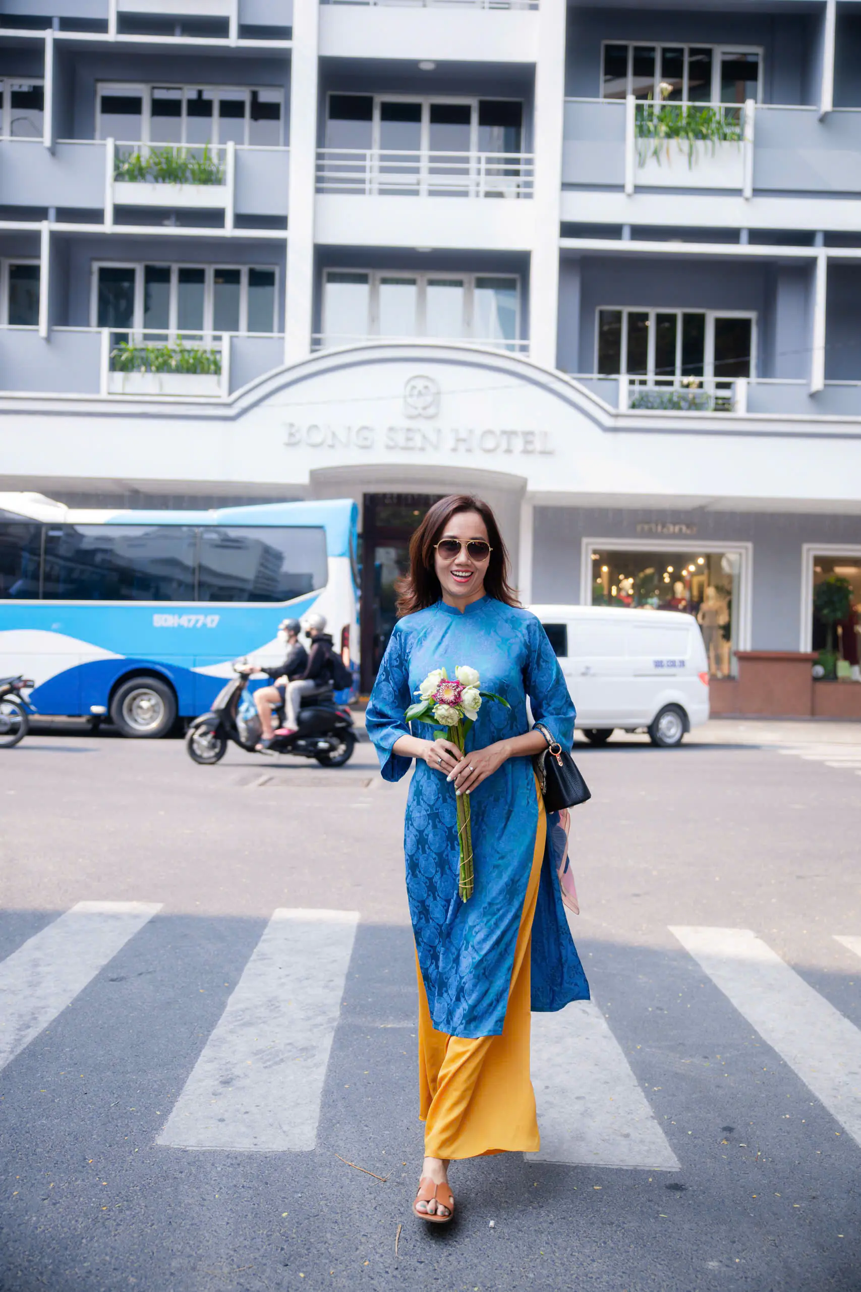 Những ngày đầu năm, Mỹ Xuân lựa chọn áo dài xanh họa tiết truyền thống khi dạo phố. Thiết kế tôn dáng, kết hợp quần vàng rực rỡ tạo nên tổng thể hài hòa, vừa hiện đại vừa giữ được nét nền nã. Nụ cười tươi cùng phong thái tự tin giúp cô thu hút ánh nhìn giữa khung cảnh rực sắc hoa xuân.