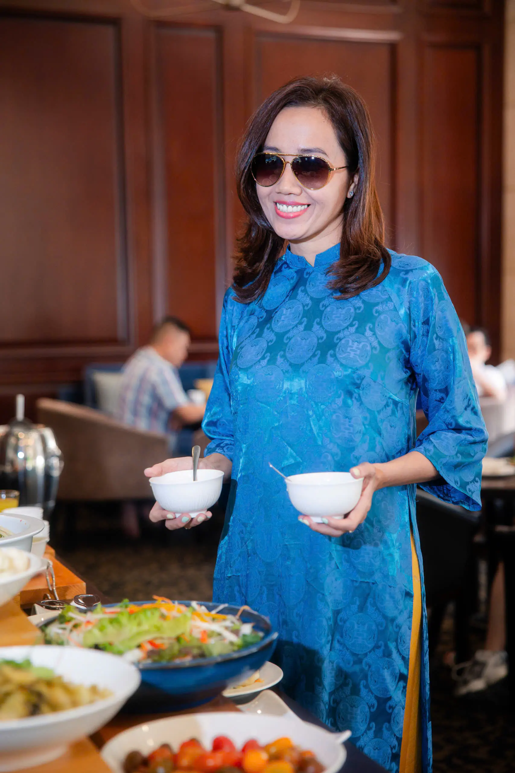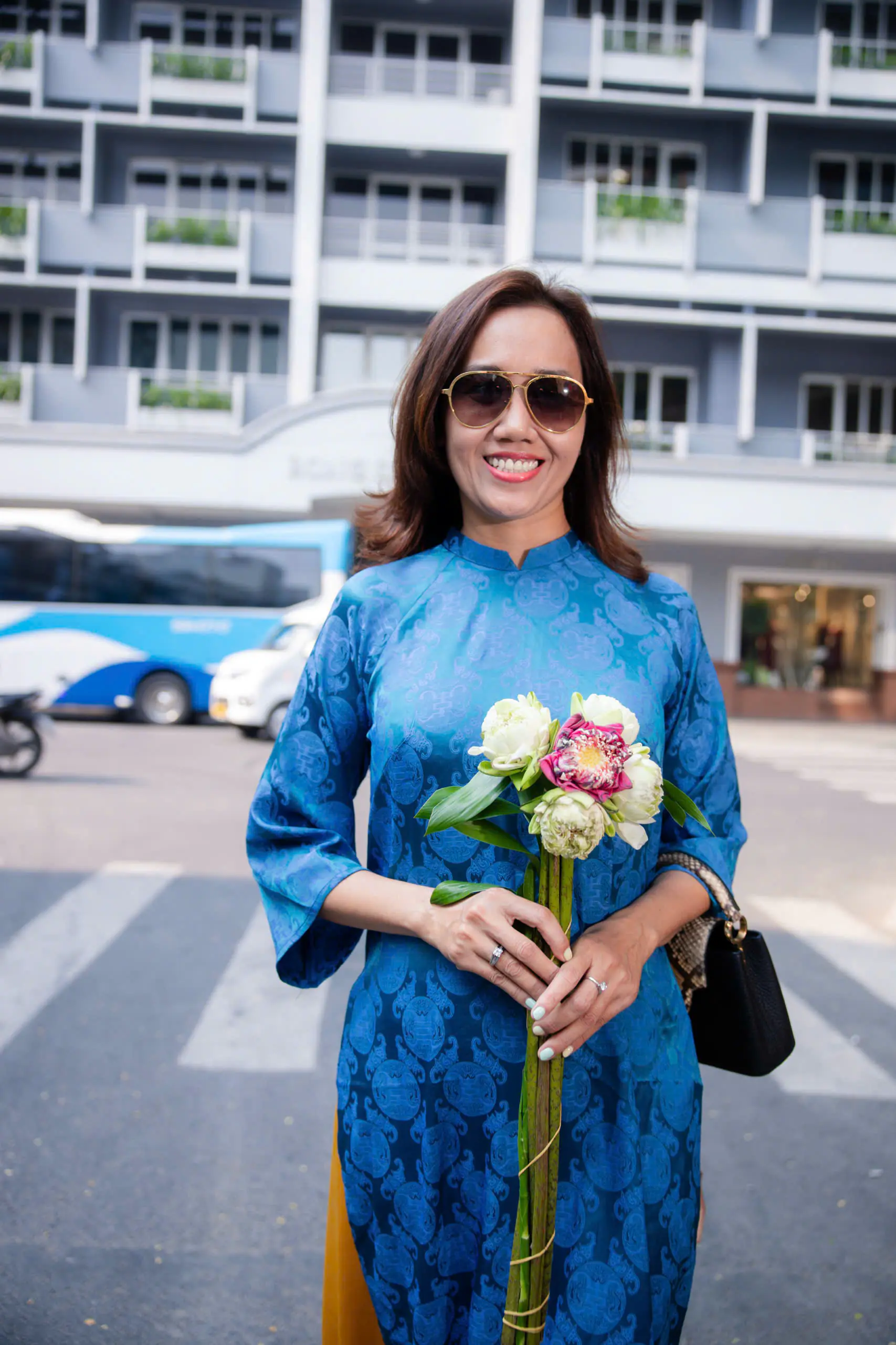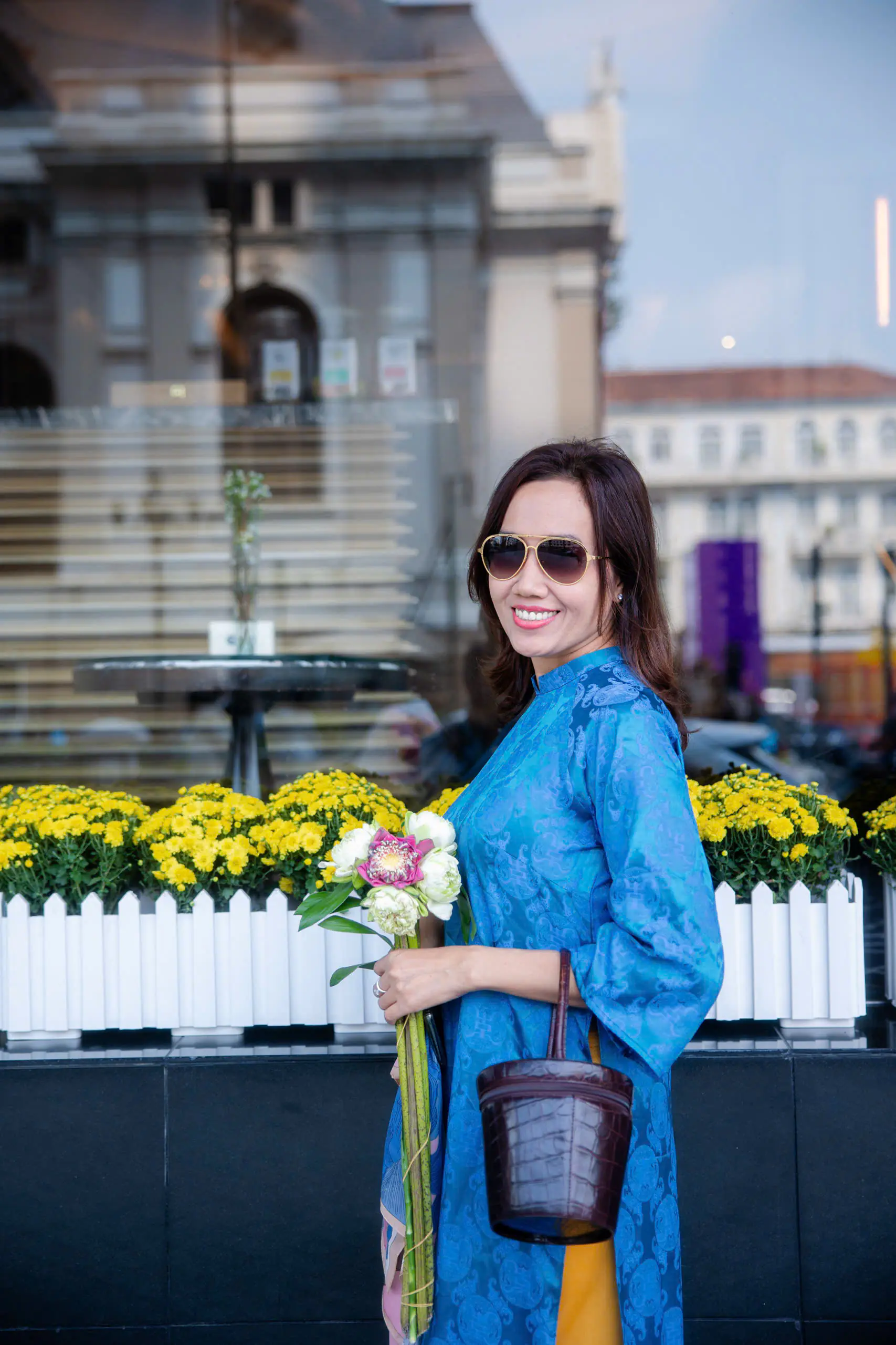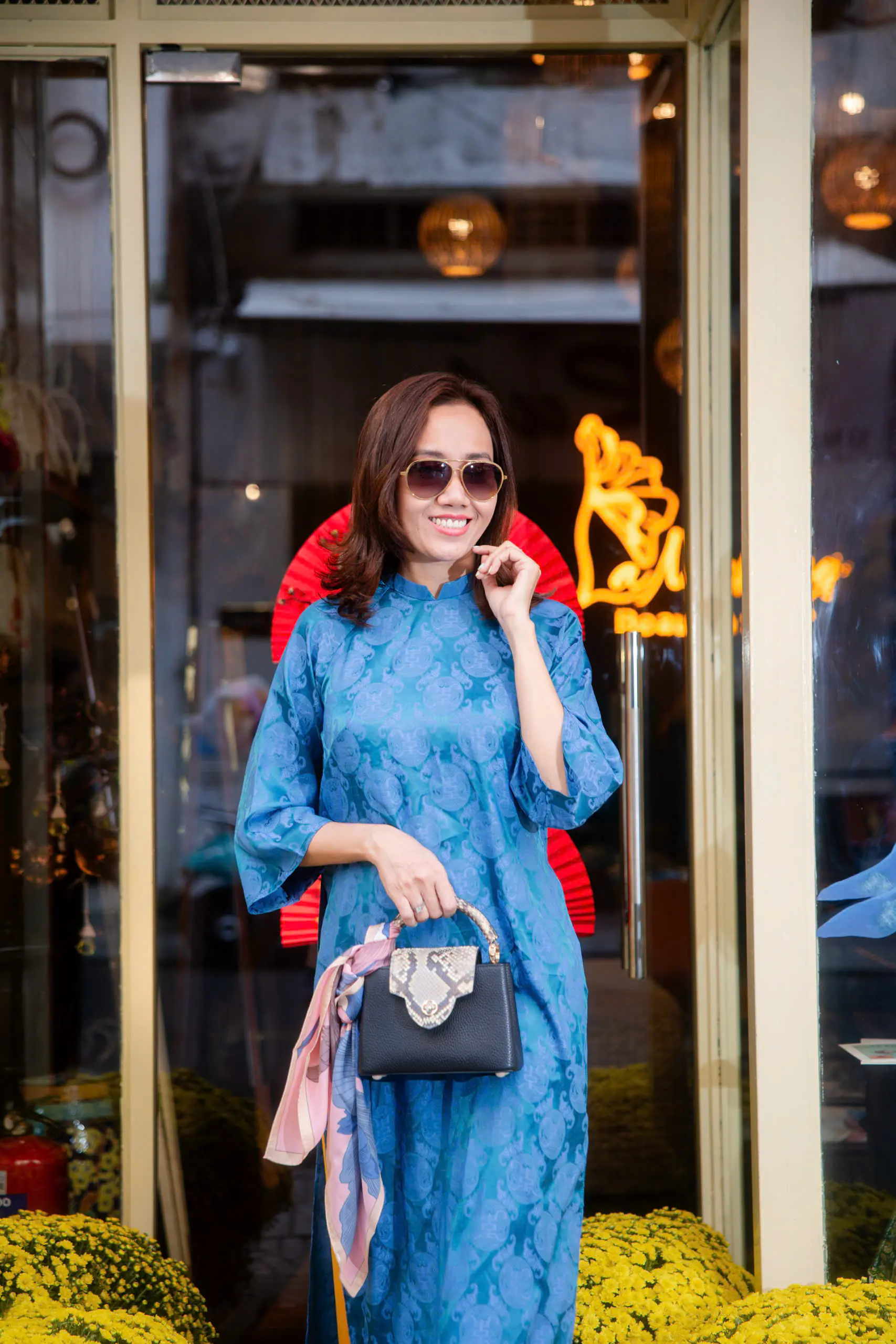 Những ngày đầu năm, Mỹ Xuân lựa chọn áo dài xanh họa tiết truyền thống khi dạo phố. Thiết kế tôn dáng, kết hợp quần vàng rực rỡ tạo nên tổng thể hài hòa, vừa hiện đại vừa giữ được nét nền nã. Nụ cười tươi cùng phong thái tự tin giúp cô thu hút ánh nhìn giữa khung cảnh rực sắc hoa xuân.